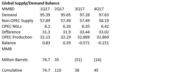 I combined OPEC’s own projections of demand and non-OPEC supply with OPEC’s July production to forecast for the balance of 2017. The figures show a 51 million barrel decline in the third quarter and a 14 million barrel decline in the fourth quarter. However, inventories rose by 110 million barrels in the first half of the year. And so the annual impact is a 45 million barrel build for the year.