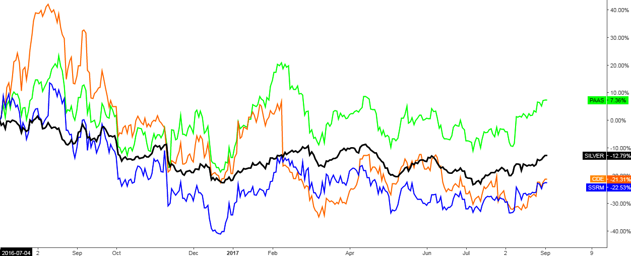 Coeur Mining is the regular favorite among peers selected by different criteria. It usually has wild moves on the chart and it always tends to overshoot the metal’s trend both to the upside and the downside.