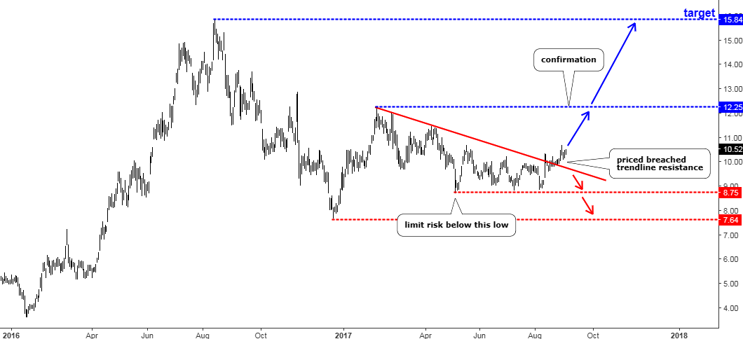 This upside move could reach the previous top at the $15.84 mark. It could be confirmed when the price breaks above the upper part of the consolidation structure established at the $12.25 level. Risk should be limited below the $8.75 mark where May’s low is located. The risk/reward ratio is around 3, which is a very healthy number.