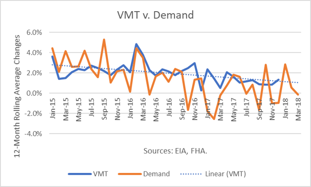 Comparing 12-month moving average trends (to smooth out the noise in the data), the demand data is much more volatile than the VMT data. And the linear trend line of VMT is downward-sloping, with the latest (January) data showing a gain of 1.3%.