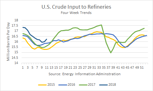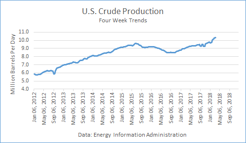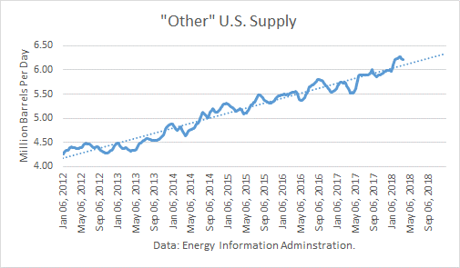 I have previously noted in an article how the “Other Supply,” primarily natural gas liquids and renewables, are integral to petroleum supply. The EIA reported a 51,000 b/d increase last week. The 4-week trend in “Other Supply” averaged 6.210 mmbd, up 10.6 % over the same weeks last year. In YTD, they are 9.5 % higher in 2018 v. 2017.