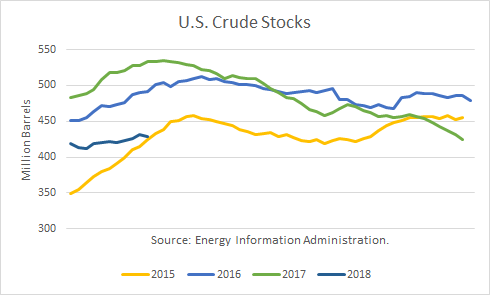 According to the Energy Information Administration (EIA), U.S. petroleum inventories (excluding SPR) fell by 6.9 million barrels (mmb) last week. They stand about 52 mmb lower than the rising, rolling 5-year average and are about 149 mmb lower than a year ago. However, comparing total inventories to the pre-glut average (end-2014), stocks are 127 mmb above that average.