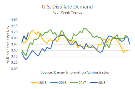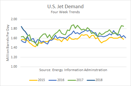 Jet fuel demand is up 4.8 % over the past four weeks. In the YTD, demand was 4.4 % higher v. 2017.