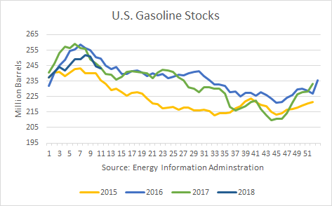 Gasoline stocks are now 0.4 mmb lower than a year ago, ending at 243.1 mmb.