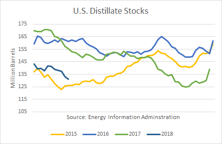 Distillate stocks are 24.3 mmb lower than a year ago, ending at 131.0 mmb.