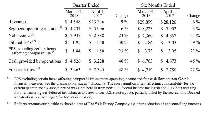 The Walt Disney Company (NYSE:DIS) reported Q2 FY2018 that ended March 31, 2018, with EPS up 30% to $1.95 from $1.50 in the prior-year quarter. Excluding certain items affecting comparability, EPS for the quarter increased 23% to $1.84 from $1.50 in the prior-year quarter. Revenue overall was up nearly double digits and came in at 9% with $14.5 billion compared to $13.3 billion over the same period last year (Figure 1).