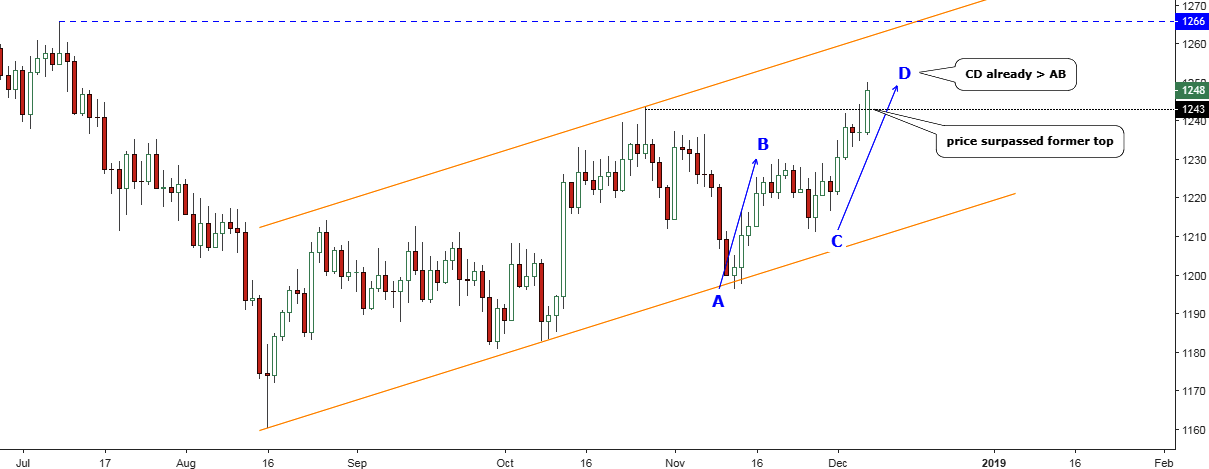 You were absolutely right a month ago as the majority of you had bet that the gold will update the October maximum of $1243. The yellow metal has hit the $1250 level right at the end of last week amid weaker than expected non-farm payrolls. Again, gold has accomplished all minimum requirements within the 3rd leg of correction. It surpassed the former top, and the CD segment of this last leg up is already 15% longer than the AB segment.