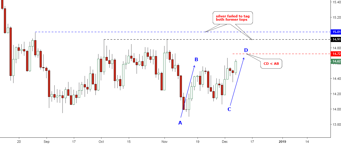 The silver is the laggard compared to gold as it failed to tag not only the former tops but also to accomplish the distance of AB segment in the CD segment, which is located at $14.72. The whole correction is flat, and the slope of it is to the downside as the second leg was underdeveloped hence it is lower than the first leg.