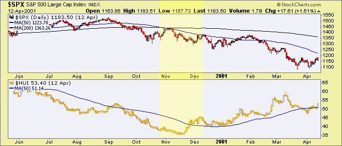 Here is the comparison of SPX and HUI from 2000 that we have been using as a template for the current situation. Very simply, when the S&P 500 bounced and failed into its initial bear market signal HUI bottomed and began its big bull market. The yellow shaded zone tells the story of the stock bull market’s failure (in bouncing to test its Death Cross of the time) and the gold stock sector’s brand new bull in 2000.