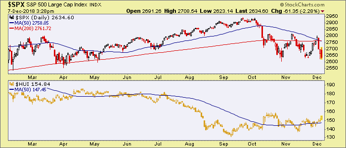 Today we have a failing stock market situation (pending the current grind at key support) and the gold stock sector making a move to go the other way. We’ve simply been noting all along that proper – as opposed to imagined – fundamentals need to be in place, and fear needs to come to conventional stock market participants. Then, almost by definition, the counter-cyclical sector can rise.