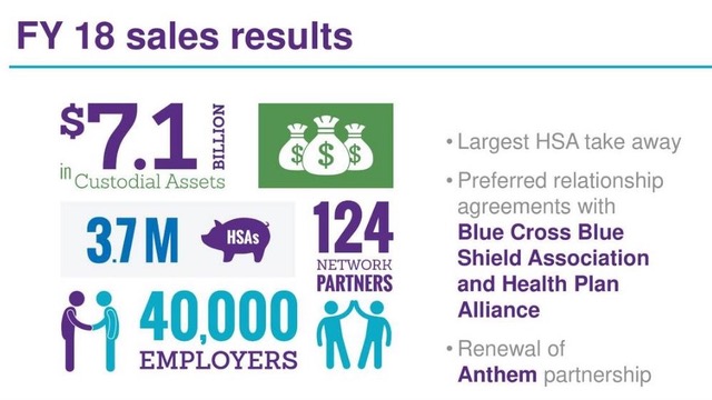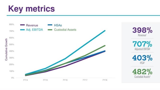 Q3 FY19 earnings delivered another double-digit growth story across the board with revenue coming in at $70.5 million, an increase of 24% year-over-year. Net income came in at $15.7 million, an increase of 50% year-over-year. Total HSA members came in at 3.7 million, an increase of 22% compared to Q3 FY18. Total custodial assets were $7.1 billion, an increase of 27% compared to year-over-year (Figure 1).