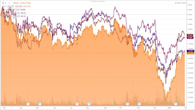 The financial cohort had been decimated in 2018 and particularly in the fourth quarter largely due by a Federal Reserve induced sell-off over rapidly rising interest rates regardless of broader economic data. Now that the Federal Reserve has taken notice and acknowledged cracks in the global trends via slowing global growth, strong U.S. dollar, trade war, government shutdown, weak housing numbers, retail weakness, auto sluggishness, and oil decline. The favorable economic backdrop of a moderately rising interest rate environment, tax reform, low unemployment, wage growth, deregulation and tax reform will allow the banks to continue their path of record profits. The inverted yield curve is typically indicative of a looming recession and will negatively impact the banks and their ability to run profitable businesses under such conditions. Fears of a Federal Reserve induced economic slowdown via interest rate increases and the potential of an inverted yield curve have been subdued as of late by Jerome Powell. The deregulation and rising interest rates coupled with a strong economy have allowed the banks to return record amounts of value to shareholders via increased share buybacks and dividends. The financial cohort is very inexpensive and poised to benefit from the easing Federal Reserve stance on rising interest rates for the foreseeable future.