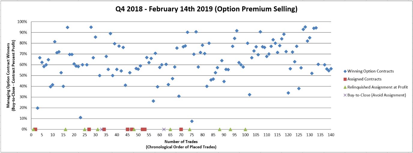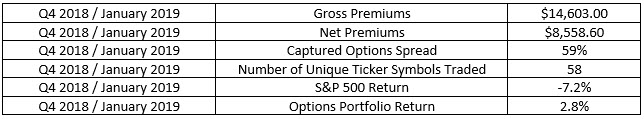 Options trading can be a fantastic avenue to mitigate risk; provide consistent income, lower cost basis of underlying stock positions and hedge against market movements while maintaining liquidity. Risk mitigation is particularly important given the market wide melt-down during Q4 of 2018. Maintaining liquidity via maintaining cash on hand to engage in covered put option selling is a great way to collect monthly income via premium selling. Heeding critical variables such as implied volatility, implied volatility percentile and probability, one can optimize option selling to yield a high probability win rate over the long term given enough trade occurrences. I demonstrated via empirical data how these critical elements translate from predictive high probability outcomes to reality. In the end, options are a bet on where the stock won’t go, not where it will go and collecting premium income throughout the process. These empirical data demonstrate that the probabilities play out given enough occurrences over time. Despite a small sample size (131 trades) in a period where the market seesawed from erasing all of its gains for 2018 to posting its best January in 30 years, an 85% win rate was achieved while outperforming the broader market by a spread of 10% from October of 2018 through January of 2019 (S&P -7.2% vs. 2.8%).