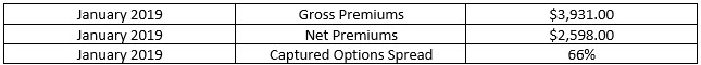 Since then, the month of January presented the polar opposite market scenario with the S&P closing out the best January in over 30 years. Maintaining the same trading mechanics deployed in Q4 of 2018 into January produced a portfolio return of 9.26% against the S&P 500 return of 7.87%, outperforming the index by a healthy margin. This seesaw from a negative to a positive market backdrop provided unique opportunities to capitalize on option trading via capturing a higher percentage of premium income, closing contracts early in the option lifecycle and relinquishing previously assigned contracts, which allowed the repurposing of capital for further options trading. In January, I was able to achieve a 100% options win rate by closing 30 out of 30 option contracts while maintaining capital liquidity.