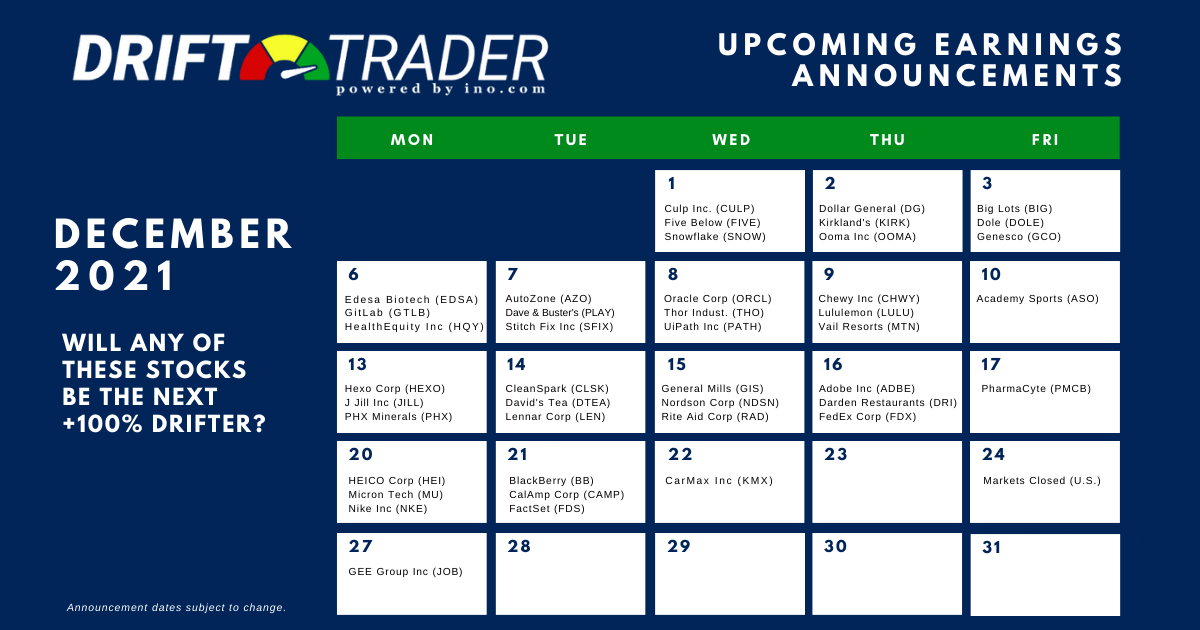 Nonetheless, December is front-loaded with earnings announcements which means there are still some big opportunities on the horizon for traders who know how to find big earnings plays.