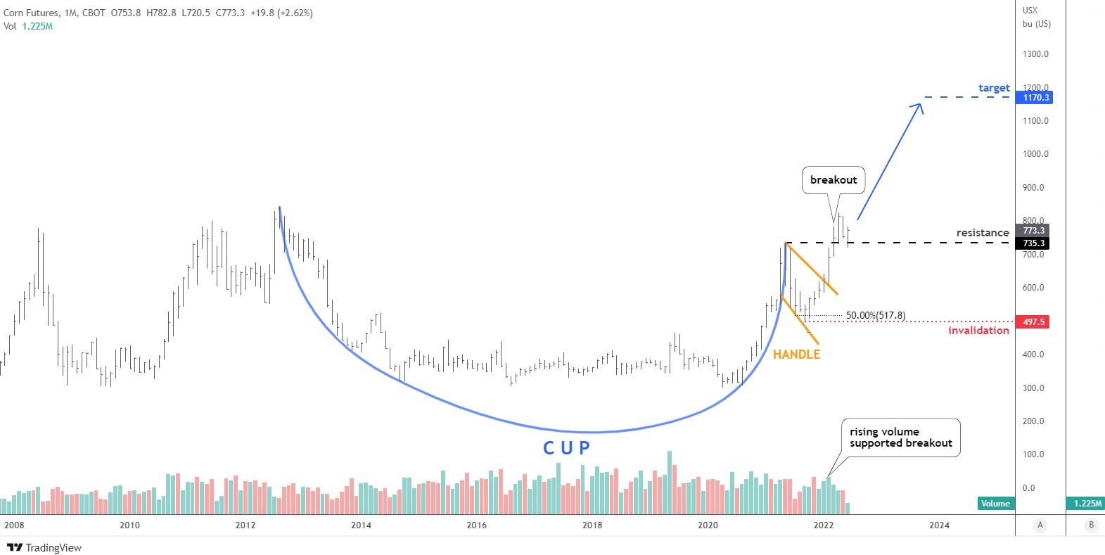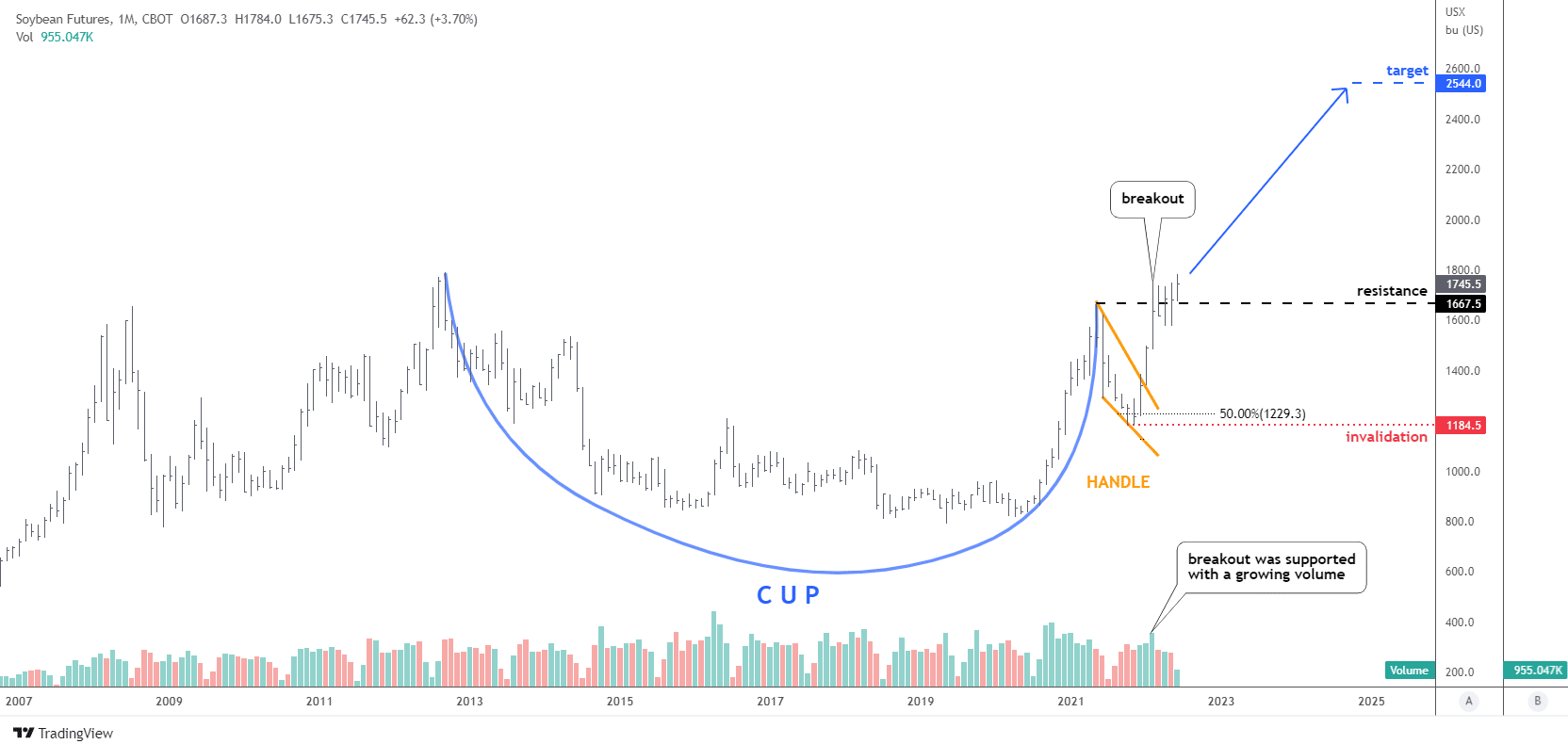 The bullish move in corn futures at the start of this year has been even stronger as the price rallied both over the handle and over the trigger of $7.353/bushel. This huge move almost hit the all-time high of the left peak of the cup. The rising volume has confirmed the actual demand in the market.