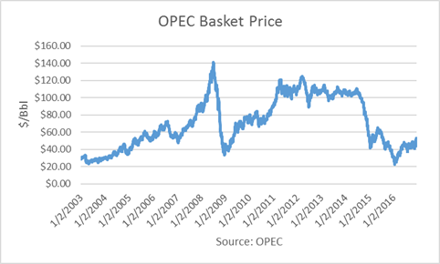 But in conjunction with announcing Saudi Arabia's 2017 budget, Mr. Al-Falih said that the kingdom sees no need for addition production cuts than the ones already pledged by the OPEC and some non-OPEC producers. He said the market intervention is intended only to "nudge along" the re-balancing of an oversupplied global oil market. He said he expects oil prices to rise "tangibly" from the 2016 average, and assumes oil will average $55 in 2017 and $61 in 2018. OPEC's Reference Basket (ORB) was $52.25 on December 21st, so it appears prices are close to where he expects them to average next year.
