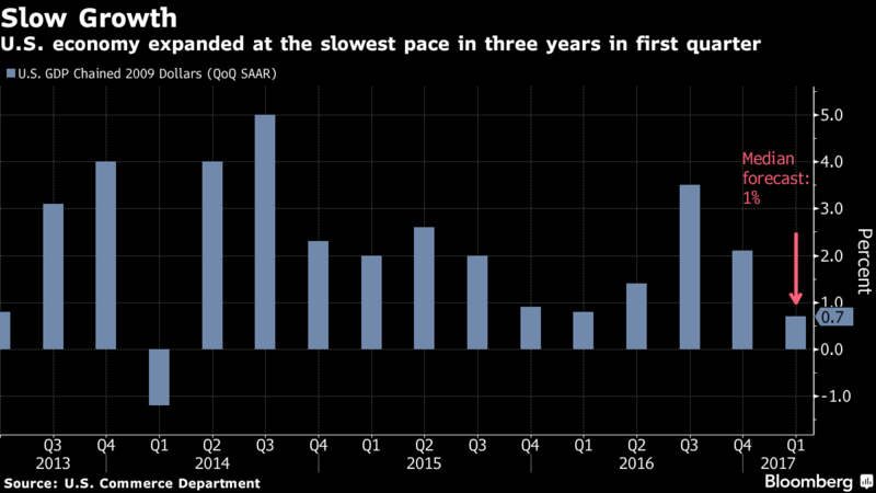 Hello MarketClub members everywhere. The U.S. stock market is slightly lower this afternoon after data showed that the U.S. economy grew at its weakest pace in three years for the first quarter of 2017. The GDP increased at a 0.7% annual rate, below the 1.2% rise estimated by economists, as consumer spending barely increased and businesses invested less on inventories.