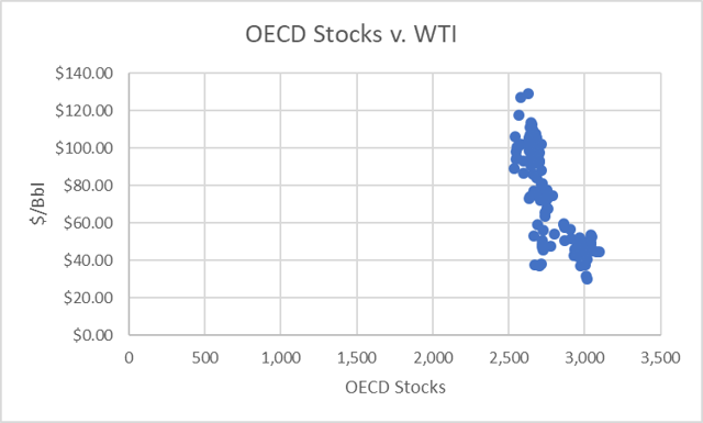 The other qualification is that the marginal cost of production and the timing of supply response have changed greatly due to the shale oil revolution. The large inventory of DUCs and much faster response of short-cycle oil has changed the market. For those reasons, lower inventories are required to support the same price. On the other hand, there is much more demand at the same price than compared to five to ten years ago. On balance, those two factors may be doing a good job canceling each other out since my regression using forward cover, instead of stocks, produced a lower correlation.