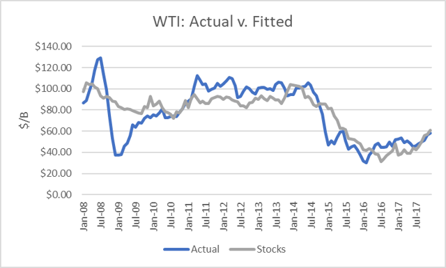 This illustrates how far prices can travel from an equilibrium price, especially in 2008-09. On the other hand, the fitted prices do match up with actual prices over time. And the December 2017 fitted price ($61) is quite close to the actual price ($58).