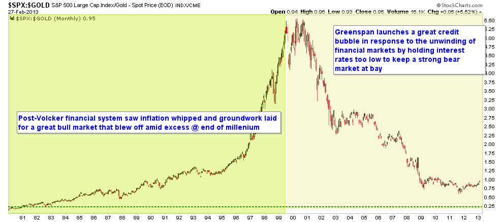 It has been a relentlessly bullish decade (plus) for gold vs. the broad US stock market as the previous stock bull market flamed out and the former Fed chief chose inflation as the preferred means of managing the US economy. We are in the age of Inflation onDemand ™, with stock market performance the result of manipulation of interest rates and currency.