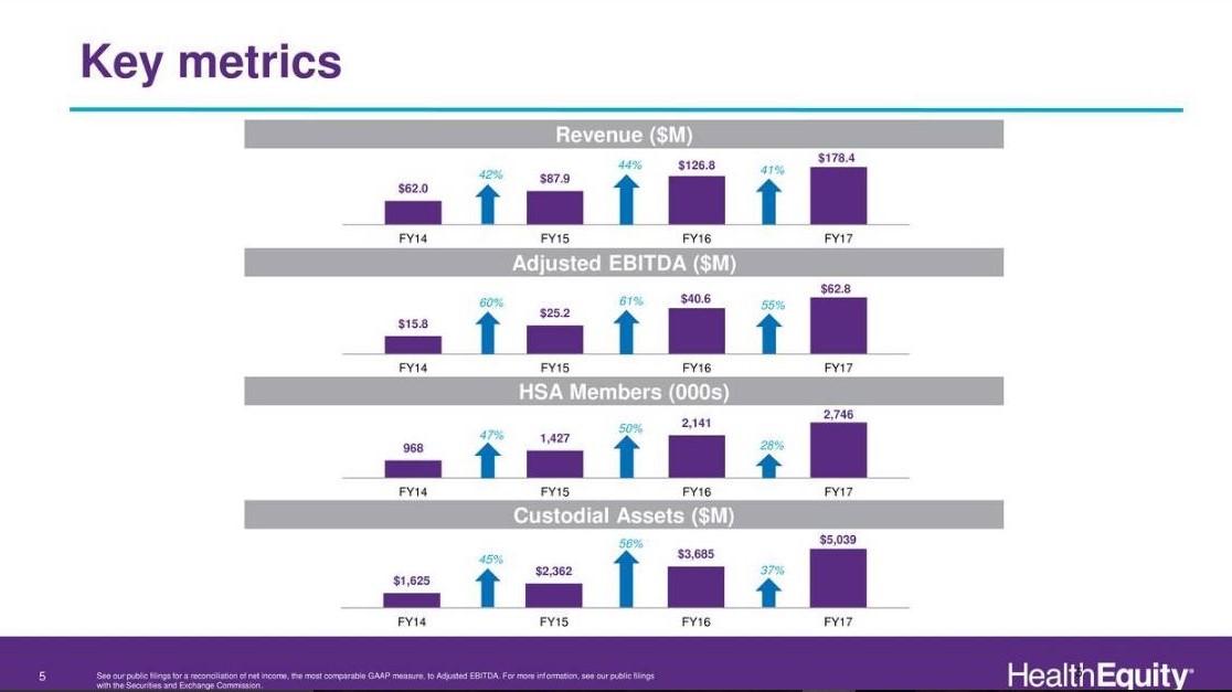 I’ve written a handful of articles highlighting HealthEquity Inc. (NASDAQ:HQY) in 2017 as a great growth play in the rapidly growing Health Savings Accounts (HSAs) space. HealthEquity just reported beats on both the top and bottom line, beating revenue and EPS estimates by $1.39 million and $0.04, respectively. It’s noteworthy to point out that revenue was up 30% year-over-year for its Q3 FY18 quarter. HealthEquity is a major player in the HSA secular growth market and has continued to gain market share over the years. HealthEquity has posted annual revenue growth of 42%, 44%, and 41% when comparing FY14 to FY15, FY15 to FY16 and FY16 to FY17, respectively. If consensus estimates are accurate for FY18, revenue growth will come in at 27% when comparing FY17 to FY18 (Figure 1). The sustainability of this growth will likely move in lock-step with the growth in the HSA market in addition to optimizing revenues extracted from the investments within these accounts via offering investment advising, collecting fees from the investment line-up and its newly announced 401k with paired HSA offerings. I feel that HealthEquity will continue to post strong growth as it services the double-digit HSA growth market and manages more assets and investments within these accounts. As HealthEquity rolls out additional products such as the launch of its 401k offerings paired with HSA accounts, HSA members elect to invest money within these accounts and accounts age; revenue will continue to accelerate with stock appreciation.