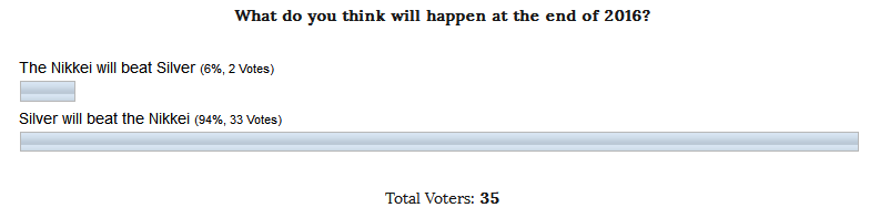 I think we witnessed the maximum divergence at 22% between these two instruments when I posted a snapshot of the experiment last October. But the final outcome is just astonishing! The Nikkei hit above the +20% handle while the silver also hit the 20% mark but with a minus sign. It is easy to calculate that the divergence peaked above the 40% mark. It means that for the past half year those who sold the silver and bought the Nikkei could book more than 40% of the trade in 6 months.