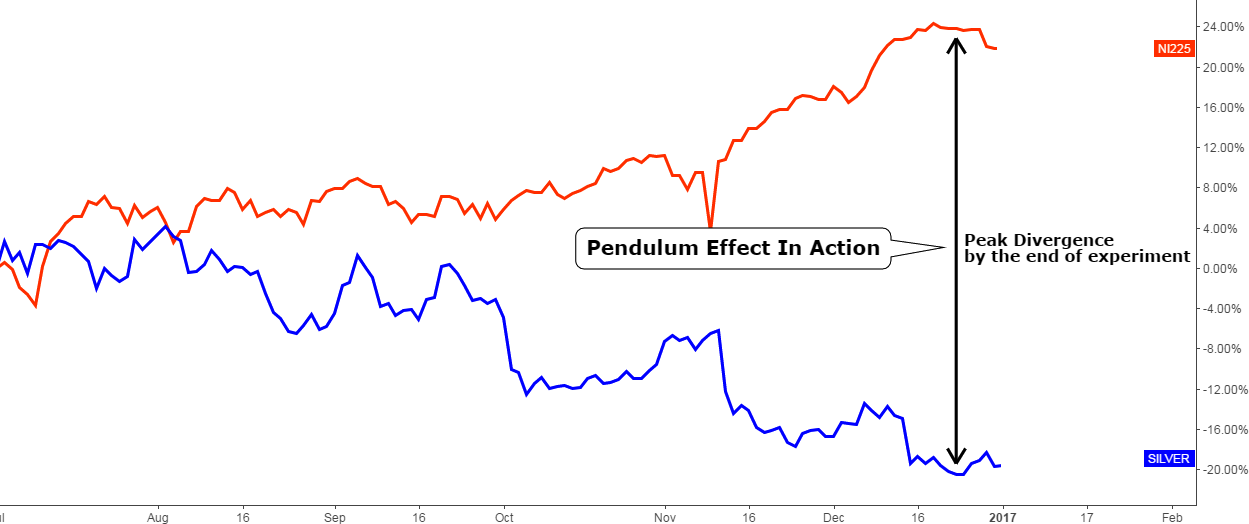 This is the summary of the second experiment that I started in the middle of 2016 where we put the ultimate loser – the stock index of struggling Japanese economy against the top gaining favorite metal – silver.