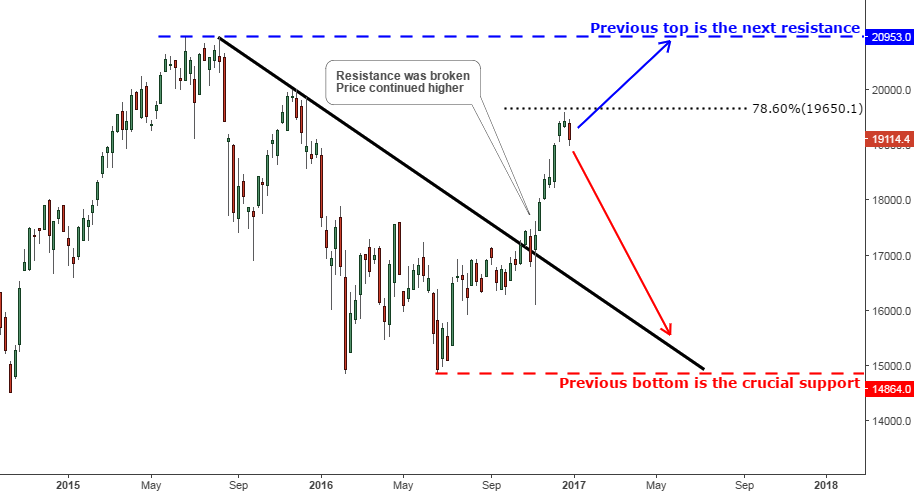 Last October we witnessed a breakup of the resistance (black), after that we can see that the price continued higher in the direction of the break. Price rocketed ¥17k to ¥19k level, but then it stalled ahead of 78.6% Fibonacci retracement level set at ¥19650 mark. The index has lost more than a half thousand already after reversal. This setback can start another drop down to the broken resistance at least or even lower to the range’s bottom highlighted in-dash red horizontal line. The break above the 78.6% Fibonacci level opens the way to the previous top at ¥20953.The risk/reward ratio favors short entry as resistance is closer than the support.