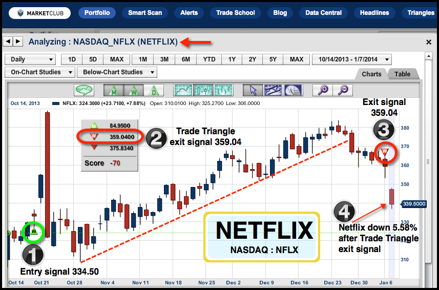 Netflix had a recent Trade Triangle exit signal at $359.04 on 1/6/14. The very next day this stock dropped like a brick and shaved 5.58% off the value of this company. That’s why Trade Triangles matter.