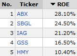 When you buy stocks, you become shareholders of the company participating in the equity. That is why this time I decided to sort the gold stocks by ROE (return on equity) and chose the top 5 (in the table below) to analyze. The range includes stocks with a market cap over $300 million.