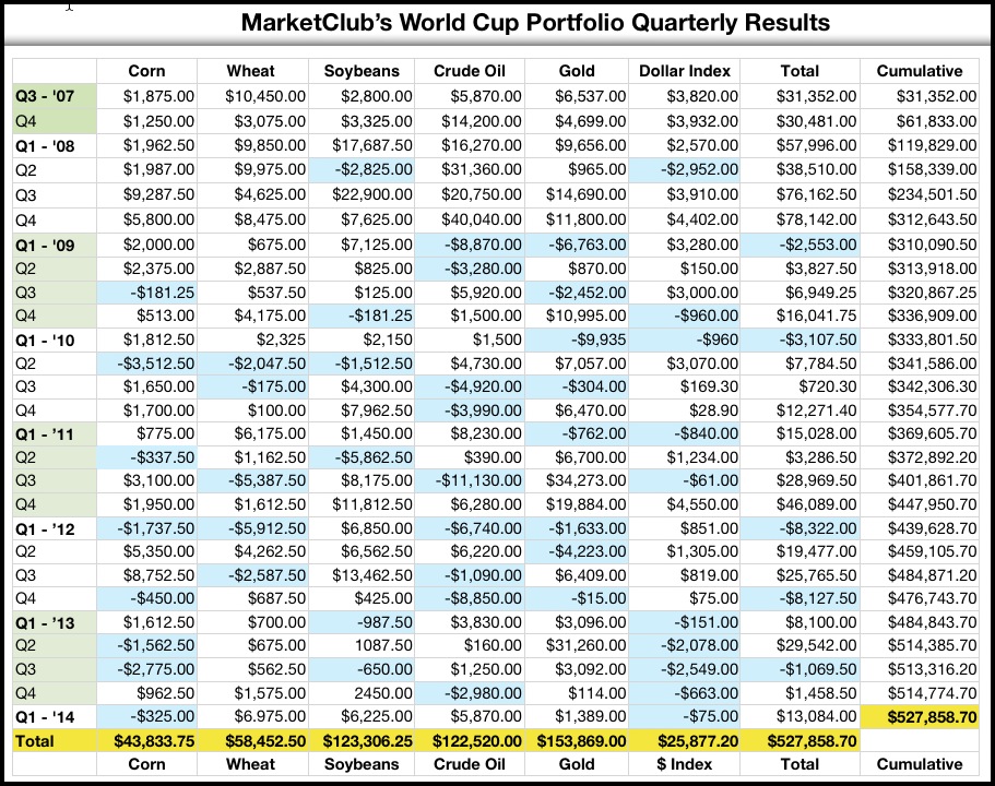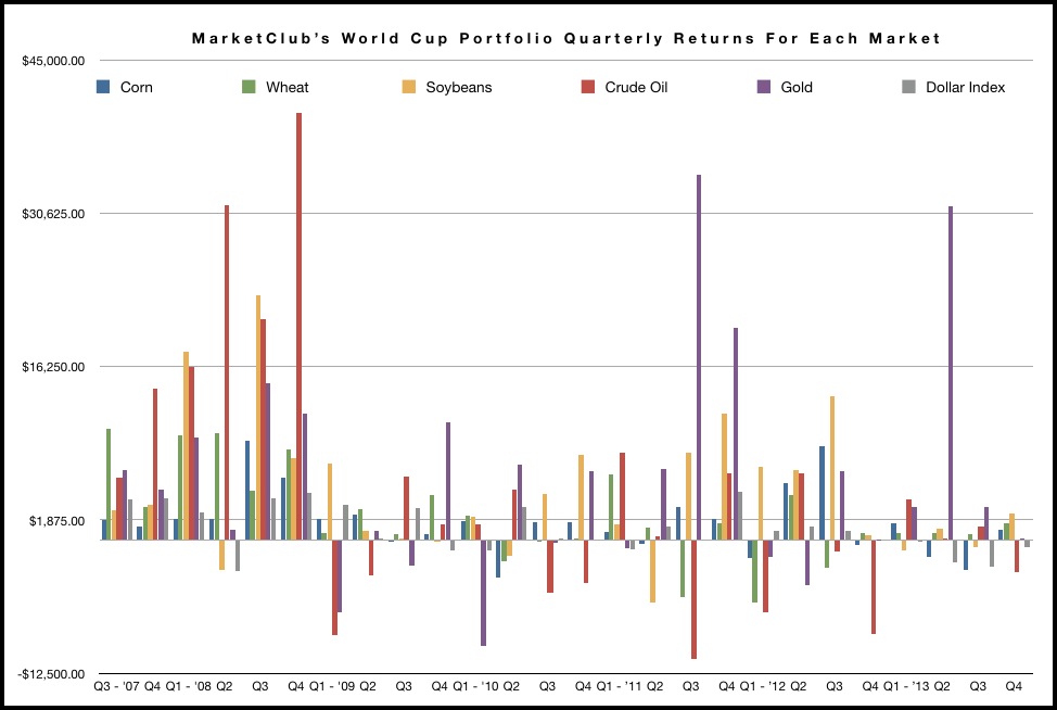 The graph below shows you the six asset classes that make up MarketClub's World Cup Portfolio and illustrates how important it is to be diversified in your portfolio. Diversification can help lower your risk and improve your odds of making money in any given year.